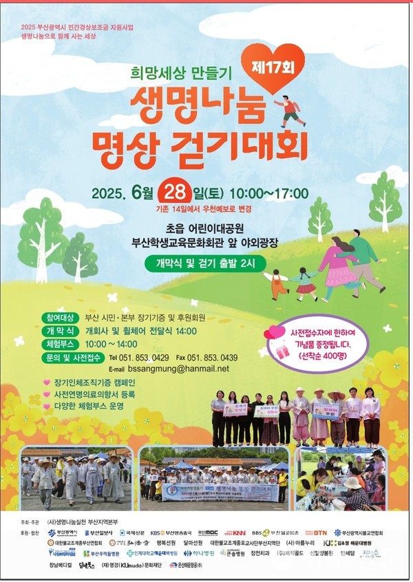 »ý¸í³ª´®½Çõ ºÎ»êÁö¿ªº»ºÎ(º»ºÎÀå ½É»ê ½º´Ô)´Â 6¿ù 28ÀÏ ¿ÀÀü 10½ÃºÎÅÍ ¿ÀÈÄ5½Ã±îÁö ºÎ»ê ÃÊÀ¾ ¾î¸°ÀÌ´ë°ø¿ø¿¡¼ ¡®Èñ¸Á¼¼»ó¸¸µé±â Á¦17ȸ »ý¸í³ª´® ¸í»ó °È±â´ëȸ¡¯¸¦ °³ÃÖÇÑ´Ù. ÀÌ Çà»ç´Â ÀÚ¿¬ ¼Ó¿¡¼ ´À¸®°Ô °È´Â ½Ã°£ ¼Ó¿¡¼ ¸í»óÀ» üÇèÇÏ´Â ÀåÀÌ´Ù. ƯÈ÷ ´Ù¾çÇÑ Ã¼Çè ºÎ½º¸¦ ÅëÇØ »ý¸íÀÇ ¼ÒÁßÇÔÀ» »õ±â´Â °ÍÀº ¹°·Ð ȯ¿ìµéÀ» À§ÇÑ ÈÙü¾î Àü´Þ½Ä, °æÇ° Ãß÷ÀÇ Àåµµ ¸¶·ÃµÈ´Ù.