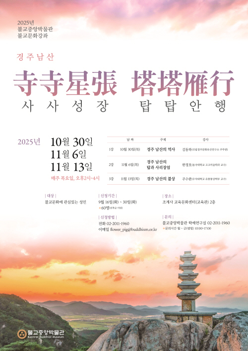 °Á´ ÃÑ 3ȸ·Î ±¸¼ºµÈ´Ù. ù ¹øÂ° °ÀÇ´Â ±èµ¿ÇÏ ±¹¸³°æÁÖ¹®ÈÀ¯»ê¿¬±¸¼Ò ÁÖ¹«°üÀÌ ¡®°æÁÖ ³²»êÀÇ ¿ª»ç¡¯¸¦ ÁÖÁ¦·Î, ½Å¶ó ºÒ±³¿¡¼ ³²»êÀÌ Áö´Ñ ¿ª»çÀû¡¤Áö¸®Àû À§»óÀ» ´Ù·é´Ù. µÎ ¹øÂ° °ÀÇ¿¡¼´Â ÇÑÁ¤È£ µ¿±¹´ë °í°í¹Ì¼úÇаú ±³¼ö°¡ ¡®°æÁÖ ³²»êÀÇ Å¾°ú »ç¸®Àå¾ö¡¯À» ÁÖÁ¦·Î ½Å¶ó ¼®Å¾ÀÇ ±¸Á¶¿Í »ó¡¼ºÀ» ¼³¸íÇÑ´Ù. ¸¶Áö¸· °ÀÇ¿¡¼´Â ÁÖ¼ö¿Ï ¿ì¼®´ë ±³¼ö°¡ ¡®°æÁÖ ³²»êÀÇ ºÒ»ó¡¯À» ÁÖÁ¦·Î, ¸¶¾ÖºÒ°ú ¼®ºÒ¿¡ ´ã±ä ¹ÌÇаú ½Å¾Ó¼¼°è¸¦ ޱ¸ÇÑ´Ù.
