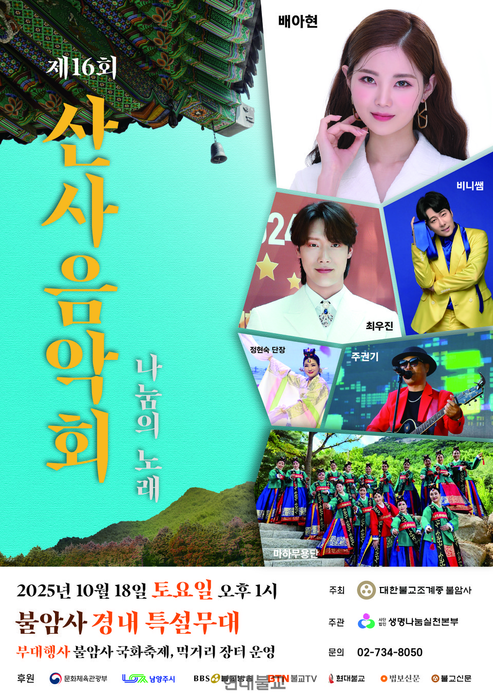 ¿ÃÇØ·Î 16ȸ¸¦ ¸ÂÀº ºÒ¾Ï»ç »ê»çÀ½¾Çȸ´Â »ý¸íÁ¸Áß °¡¸£Ä§À» ³ª´©°í ÀÌ¿ô°ú ÇÔ²² ´õºÒ¾î »ç´Â ±æÀ» °È°íÀÚ ¸¶·ÃµÆ´Ù. ºÒ¾Ï»ç ÇÕâ´ÜÀÇ °ø¿¬À¸·Î ½ÃÀ۵Ǵ À½¾Çȸ¿¡´Â ¸¶ÇϹ«¿ë´ÜÀ» ºñ·ÔÇØ ¹è¾ÆÇö, ÃÖ¿ìÁø, ºñ´Ï½Ü, ÁֱDZ⠵î ÃÊ´ë °¡¼öµéÀÌ Ãâ¿¬ÇØ ±í¾îÁö´Â °¡À» Á¤Ãë¿¡ ¾î¿ï¸®´Â ³ë·¡¸¦ ¼±º¸ÀÏ ¿¹Á¤ÀÌ´Ù. »çȸ´Â ÀÌÀͼ± »ý¸í³ª´®½Çõº»ºÎ È«º¸´ë»ç°¡ ¸Ã¾Æ ¹à°í À¯ÄèÇÏ°Ô ÁøÇàÇØ ³ª°£´Ù.