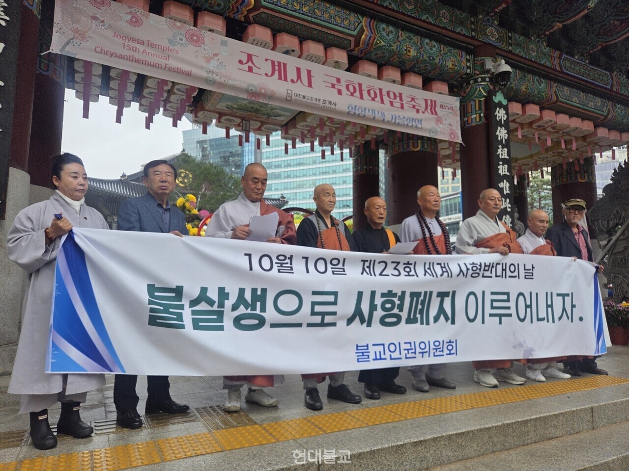 10¿ù 10ÀÏ Á¦23ȸ ¼¼°è »çÇü ÆóÁöÀÇ ³¯À» ¸Â¾Æ ºÒ±³ÀαÇÀ§¿øÈ¸(°øµ¿´ëÇ¥ Áø°ü‧µµ°ü ½º´Ô)°¡ ¼¿ï Á¶°è»ç ÀÏÁÖ¹® ¾Õ¿¡¼ ±âÀÚȸ°ßÀ» ¿°í »çÇüÁ¦ Áï°¢ ÆóÁö¸¦ Ã˱¸ÇÏ´Â ¼º¸íÀ» ¹ßÇ¥Çß´Ù.