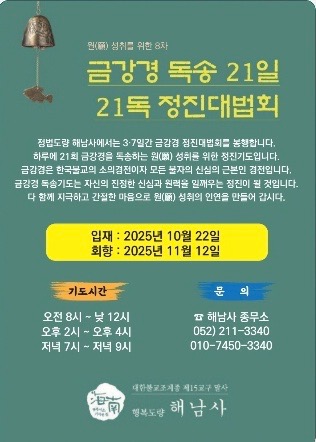 ¿ï»ê ÇØ³²»ç(ÁÖÁö Çý¿ø ½º´Ô)´Â ¿À´Â 10¿ù 22ÀÏ ¿ÀÀü 10½Ã ÀÔÀç½ÄÀ» ½ÃÀÛÀ¸·Î 11¿ù 12ÀϱîÁö 21ÀÏ µ¿¾È ¡®¿ø(êÃ) ¼ºÃ븦 À§ÇÑ Á¦8Â÷ ±Ý°°æ µ¶¼Û 21ÀÏ 21µ¶ Á¤Áø´ë¹ýȸ¡¯¸¦ ºÀÇàÇÑ´Ù.