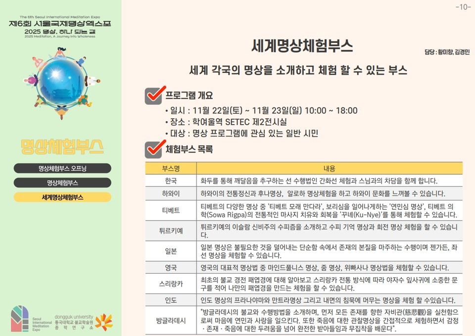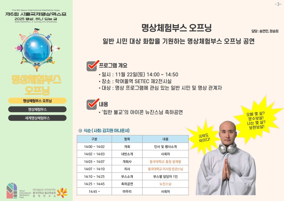 µ¿±¹´ë ºÒ±³Çмú¿ø Á¾Çבּ¸¼Ò(¼ÒÀå Á¤µµ ½º´Ô)´Â 11¿ù 22ÀϺÎÅÍ 23ÀϱîÁö ¼¿ï Çп©¿ï¿ª SETEC Á¦2Àü½Ã½Ç¿¡¼ ¡®Á¦6ȸ ¼¿ï±¹Á¦¸í»ó¿¢½ºÆ÷¡¯¸¦ °³ÃÖÇÑ´Ù. ¡®2025 ¸í»ó, Çϳª µÇ´Â ±æ¡¯À» ÁÖÁ¦·Î ¿¸®´Â À̹ø Çà»ç´Â ½Ã¹ÎÀÇ Á¤½Å°Ç° ÁõÁø°ú ¸í»óÀÇ »ýȰȸ¦ µµ¸ðÇϰí, ´©±¸³ª Âü¿©ÇÒ ¼ö ÀÖ´Â ¿¸° ÃàÁ¦·Î ¸¶·ÃµÆ´Ù.