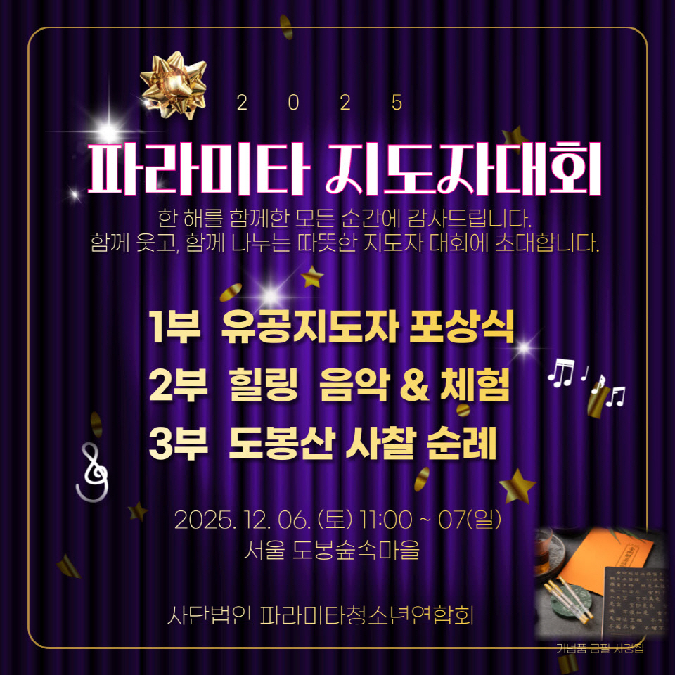 û¼Ò³â Æ÷±³±â±¸ »ç´Ü¹ýÀÎ ÆÄ¶ó¹ÌŸû¼Ò³â¿¬ÇÕȸ(ȸÀå Á¤¹«½º´Ô,Æ÷±³ºÎÀå)´Â 12¿ù 6ÀϺÎÅÍ 7ÀϱîÁö 1¹Ú 2ÀÏ µ¿¾È ¼¿ï µµºÀ½£¼Ó¸¶À»¿¡¼ ¡®2025³â ÆÄ¶ó¹ÌŸ Àü±¹ ÁöµµÀÚ´ëȸ¡¯¸¦ °³ÃÖÇÑ´Ù.