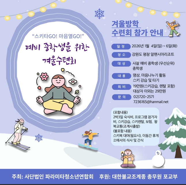 À̹ø ¼ö·Ãȸ´Â û¼Ò³â(¿¹ºñ ÁßÇлý Æ÷ÇÔ)µéÀÌ °Ü¿ï ¼³¿ø¿¡¼ ½ºÅ° °½À ¹× Ÿ±â¿Í ¸í»ó, ¸¶À½³ª´©±â Ȱµ¿ µîÀ» ÅëÇØ ¸ö°ú ¸¶À½ÀÇ ¼ºÀåÀ» ÀÌ·ç¸ç Àڽۨ°ú ¼ÒÅ롤¹è·Á¡¤Çù·ÂÀÇ Åµµ¸¦ ±â¸£°í »õ·Î¿î Çгâ°ú °ü°è¸¦ ¸ÂÀÌÇÒ ÈûÀ» ±æ·¯ÁÖ±â À§ÇØ ¸¶·ÃµÆ´Ù.