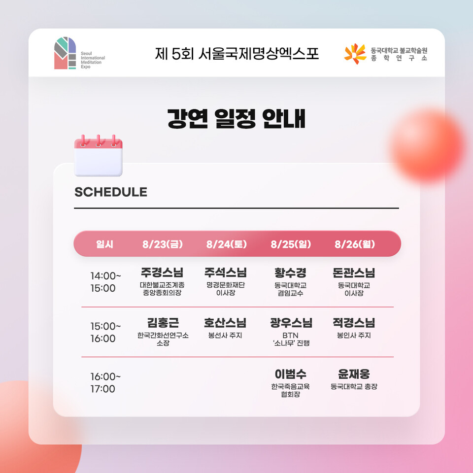 ´ÙÀ½³¯¿¡´Â ¼¼ °³ÀÇ °¿¬ÀÌ ¸¶·ÃµÆ´Ù. Ȳ¼ö°æ µ¿±¹´ë °âÀÓ±³¼ö°¡ ³ª´Â '³» ¸¶À½ÀÇ ÁÖÀÎÀΰ¡?'¿¡ ´ëÇØ À̾߱⠹°²¿¸¦ ư´Ù. À̾î BTN '¼Ò³ª¹«' ÁøÇàÀÚ·Î Àß ¾Ë·ÁÁø ±¤¿ì½º´ÔÀÌ ¿ÀÁ÷ ¼öÇุÀÌ »îÀÇ ÇØ´äÀÓÀ» °Á¶ÇÑ´Ù. À̹ü¼ö Çѱ¹Á×À½±³À°ÇùȸÀåÀº Á×À½°ú ¿¹Ý¿¡ ´ëÇØ °¿¬ÇÑ´Ù.