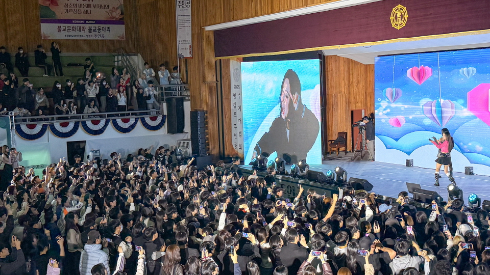 ÃàÁ¦ÀÇ ¸¶Áö¸· ÀåÀº ÀαⰡ¼ö ¡®¿¡ÀÌÇÎÅ©¡¯¿Í ¡®ºñ¿À¡¯ÀÇ °ø¿¬¹«´ë°¡ Àå½ÄÇß´Ù. ÇлýµéÀÌ ¹®¹«°üÀÌ ¶°³ª°¥µí ³ë·¡¸¦ ¶¼Ã¢ÇÏ¸é¼ ÃàÁ¦ºÐÀ§±â´Â ÃÖ°íÁ¶¿¡ ¿Ã¶úÀ¸¸ç, ¹®¹«°üÀº ûÃá°ú ºÒ¹ýÀÇ Çâ±â·Î ³ÑÃijµ´Ù.