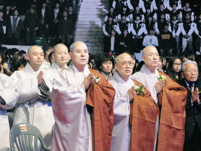 Áö³­ 23ÀÏ ¼­¿ï ÀåÃæÃ¼À°°ü¿¡¼­ ¿­¸° 2010Çг⵵ µ¿±¹´ëÇб³ ÀÔÇнĿ¡ Âü¼®ÇÑ Á¶°èÁ¾ Ãѹ«¿øÀå Àڽ½º´Ô, Çб³¹ýÀÎ µ¿±¹´ëÇб³ ÀÌ»çÀå Á¤·Ã½º´Ô, »óÀÓÀÌ»ç ¼º°ü½º´Ô(¾ÕÁÙ ¿ÞÂʺÎÅÍ)ÀÌ ¹Ý¾ß½É°æÀ» ºÀµ¶Çϰí ÀÖ´Ù.