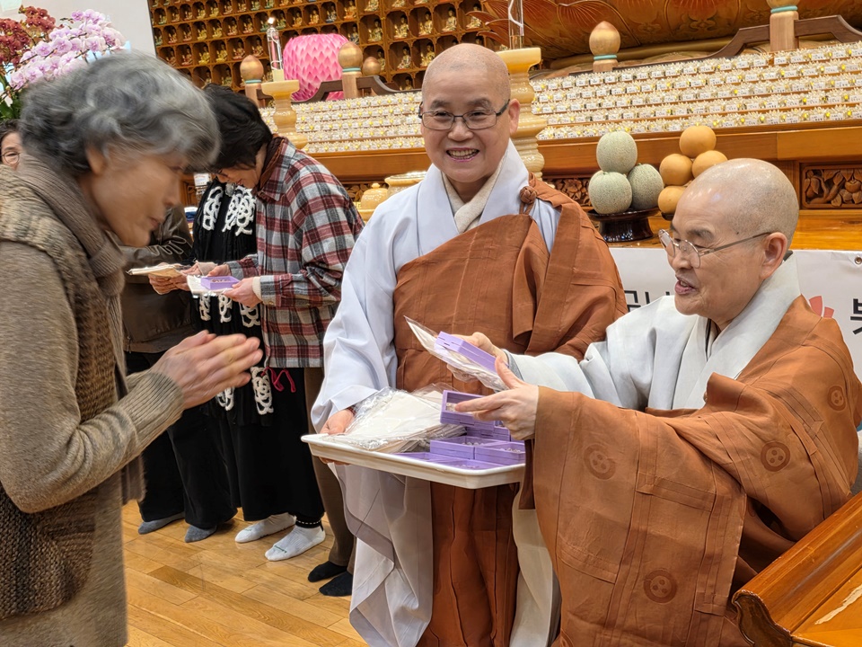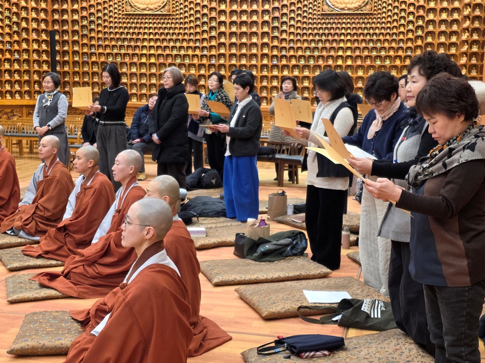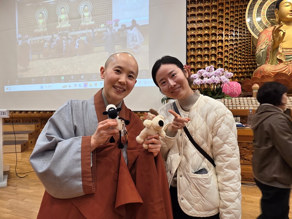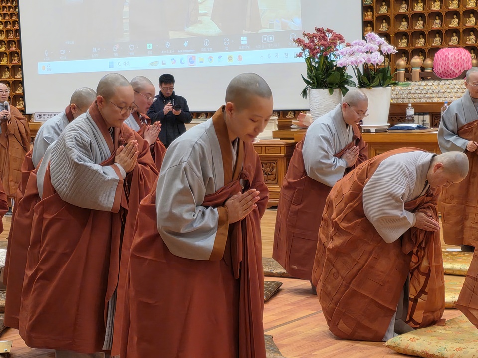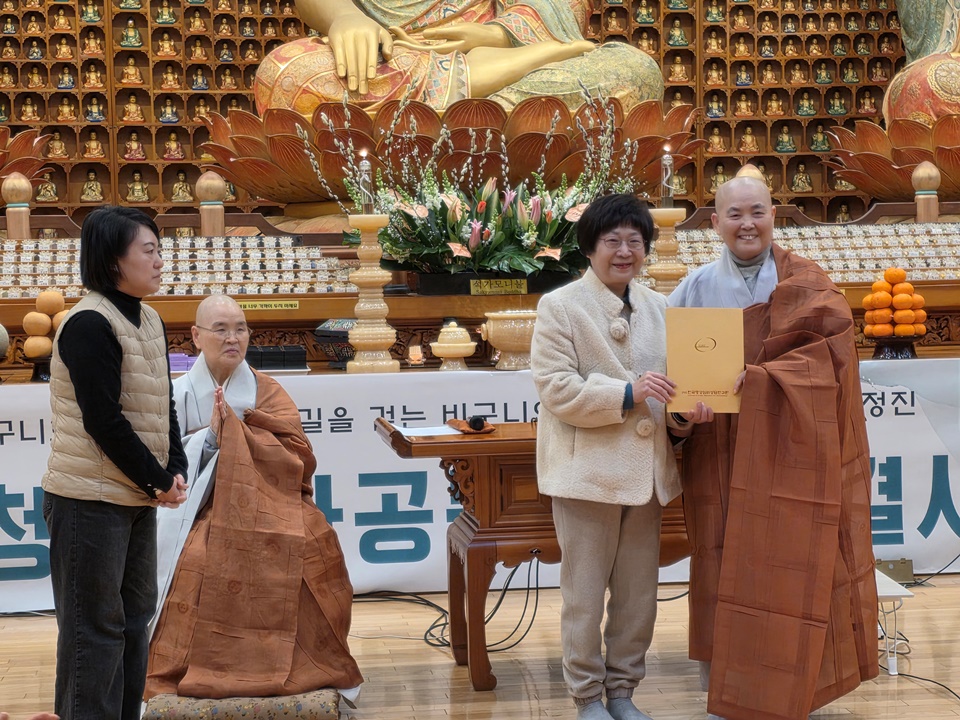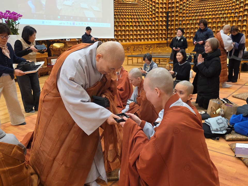 ±¤¿ë½º´ÔÀº ¡°½Ã°øÀ» ÃÊ¿ùÇÑ ¡®¼öÇ࡯À̶õ µÎ ±ÛÀÚ°¡ Àηù¸¦ »ì¸°´Ù°í º»´Ù¡±¸ç ¡°¿ì¸®´Â °¢ÀÚ ¡®³» °øºÎ¡¯¸¸ ÇÏ´Â °Í °°Áö¸¸ Àεå¶ó¸Á ¼Ó¿¡¼­ ¿©±â ÀÖ´Â ºÐµéÀÌ ¿ìÁÖÀÇ ÁÖÀΰøÀÌ¸ç ¼öÇà°ú Á¤ÁøÀ¸·Î ¿ìÁÖ¸¦ »ì¸®°í Áö±¸¸¦ »ì¸®°í Àηù¸¦ »ì¸®´Â ÀǹÌÀÖ´Â °øºÎ¸¦ ÇØ³Â´Ù¡±¸é¼­ ¡°¼­±¤½º´Ô ¸»¾¸´ë·Î óÀ½¿£ ¾î·Á¿ü¾îµµ Áö±Ý ÇູÇϵí, ¿ì¸® ¸ðµÎ ÀλýÀ» Á¹¾÷ÇÒ ¶§µµ ÀÌ·¸°Ô Áñ°Ì°Ô Á¹¾÷ÇßÀ¸¸é ÁÁ°Ú´Ù¡±°í ¸»ÇØ ¶ß°Å¿î ¹Ú¼ö¸¦ ¹Þ¾Ò´Ù. ¼öÇà°á»ç¸¦ ºû³»ÁØ 20¿©¸íÀÇ ºÀ³ç»ç ÇÐÀÎ ½º´Ôµé¿¡°Ôµµ °¨»çÀλ縦 ÀüÇϸ鼭 ¡°¿ì¸® ´ÙÀ½»ý¿¡´Â °°ÀÌ ÀÔ»êÇØ¼­ ÇÔ²² ʏ¶ÇÏ°í ¼öÇàÇØ¿ä¡±¶ó°í Çß´Ù.