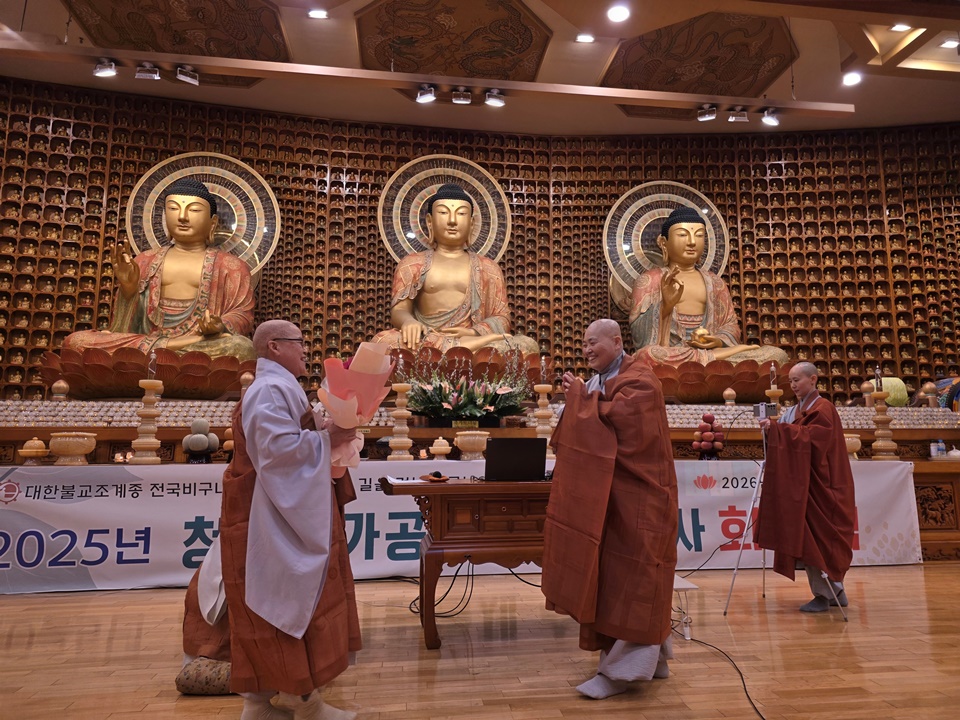 ¼­±¤½º´ÔÀ» ºñ·ÔÇÑ À̹ø ¼öÇà°á»ç¿¡ ¼ÒÀÓÀÚ·Î µ¿ÂüÇÑ ÀԽ Á¤¹¬½º´Ô, ÂûÁß ±ÝÇØ½º´Ô, Ãѹ« ±æ»ó½º´Ô, ¿Â¶óÀÎ ´Ù´ç Áö¿ì¡¤´ö»ê½º´Ô µîÀÌ ´ëÁß ¾Õ¿¡¼­ ¹Ú¼ö¿Í ȯȣ¸¦ ¹Þ¾Ò´Ù. ¼­±¤½º´ÔÀº ¸í»ó½É¸®»ó´ã°¡ 2±Þ °úÁ¤ ¼ö·áÀڵ鿡°Ô ±ô¦ ¡®ÄíÆù ¼±¹°¡¯À» ¾à¼ÓÇß°í, ÀԽ ½º´ÔÀº ´ëÁß¿¡°Ô ¹ÞÀº °¨»çÀÇ ²É´Ù¹ßÀ» ´Ù½Ã °á»ç¸ðÀÓ ÁøÇà¿¡ ¼ö°íÇØÁØ ÂûÁß ½º´Ô¿¡°Ô Àü´ÞÇÏ´Â ÈÆÈÆÇÑ ¸ð½ÀÀ» º¸¿´´Ù. ȸÇâ½ÄÀ» ½ÃÁ¾Àϰü È­±â¾Ö¾ÖÇÑ ºÐÀ§±â ¼Ó¿¡¼­ ÁøÇàµÆ´Ù.