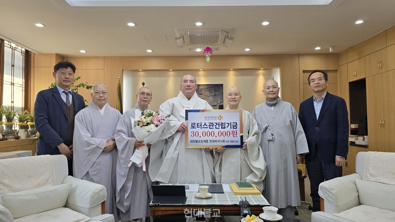 Á¶°èÁ¾ Àü±¹ºñ±¸´ÏȸÀå ±¤¿ë ½º´Ô(¿À¸¥ÂÊ¿¡¼ ¼¼ ¹øÂ°)´Â 11¿ù 4ÀÏ µ¿±¹´ë ÀÌ»çÀå µ·°ü ½º´Ô(°¡¿îµ¥)¿¡°Ô ·ÎÅͽº°ü °Ç¸³±â±Ý 3000¸¸¿øÀ» Àü´ÞÇß´Ù.